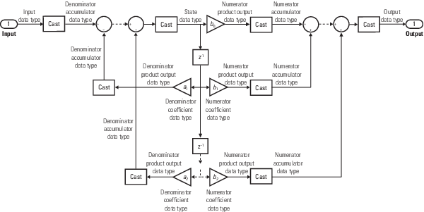 Блок дискретного фильтра независимо фильтрует каждый канал входного сигнала указанным цифровым БИХ-фильтром. Можно указать структуру фильтра как Direct form I, Direct form I transposed, Direct form II, или Direct form II transposed. Блок реализует статические фильтры с фиксированными коэффициентами. Можно настроить коэффициенты этих статических фильтров.
