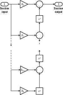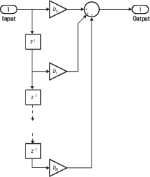 Можно изменить структуру фильтра, реализованную с помощью блока Дискретный фильтр FIR (Discreter FIR Filter), выбрав одно из следующих значений в параметре Структура фильтра (Filter structure).