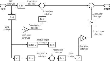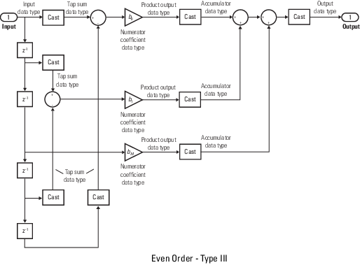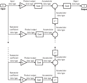 На следующих диаграммах показана структура фильтра и типы данных, используемые в блоке дискретного КИХ-фильтра для сигналов с фиксированной точкой.