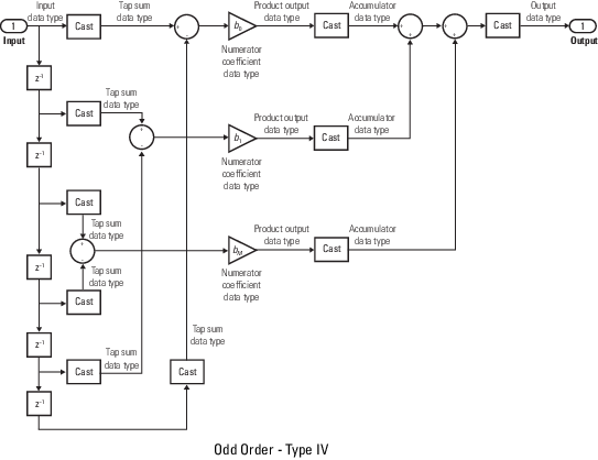 Tap sum - Выберите тип данных sumInherit: Same as input (по умолчанию) | Inherit: Inherit via internal rule | int8 | uint8 | int16 | uint16 | int32 | uint32 | int64 | uint64 | fixdt(1,16,0) | <data type expression>Укажите тип данных суммы отводов симметричного или антисимметричного фильтра прямого вида, который является типом данных, используемым фильтром при суммировании входных данных перед умножением на коэффициенты. Можно установить для него значение: