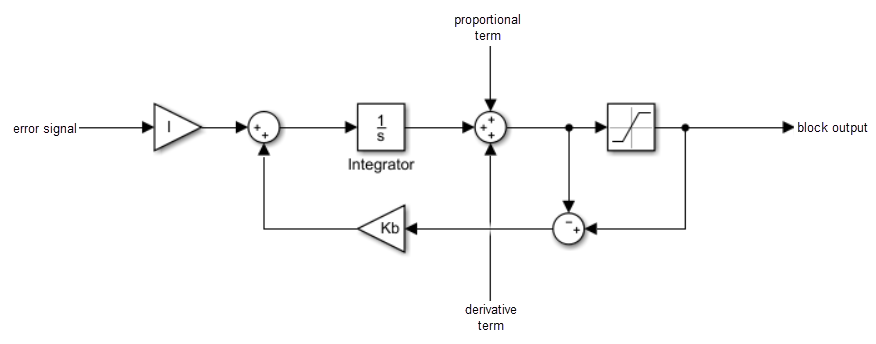 Вывод блока - сохраняет вывод блока, который находится под маской блока контроллера PID. Например, используйте выход интегратора, чтобы указать тип данных вывода блока, называемого интегратором. Этот блок находится под маской в подсистеме интегратора и вычисляет член интегратора действия контроллера.