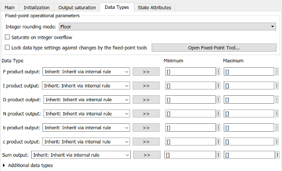 По умолчанию для всех типов данных в блоке установлено значение Inherit: Inherit via internal rule. С помощью этого параметра Simulink выбирает типы данных, чтобы сбалансировать числовую точность, производительность и размер сгенерированного кода при учете свойств встроенного целевого оборудования.