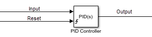 Reset - Внешний триггер сбросаТриггер для сброса интегратора и фильтрации в исходное состояние. Значение параметра External reset определяет, происходит ли сброс для восходящего сигнала, падающего сигнала или сигнала уровня. Значок порта указывает выбранный тип триггера. Например, на следующем рисунке показан блок PID непрерывного времени с параметром External reset, равным rising.