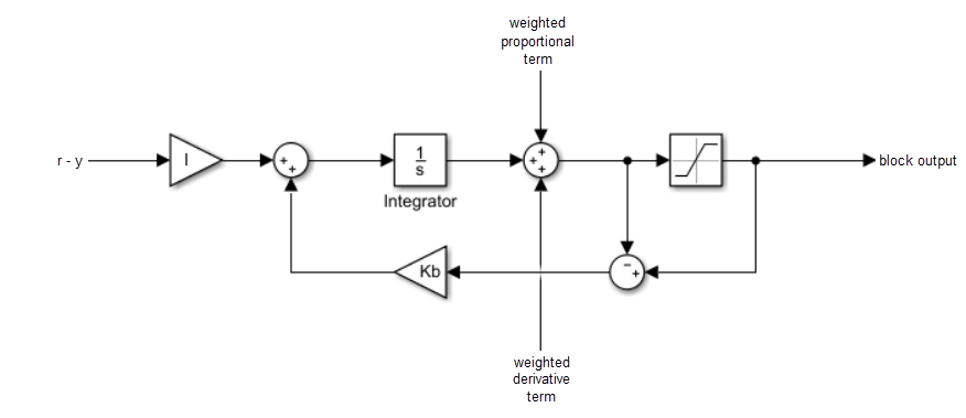 Блок генерирует выходной сигнал на основе разности между опорным сигналом и измеренным выходным сигналом системы. Блок вычисляет взвешенный разностный сигнал для пропорциональных и производных действий в соответствии с заданными весами уставок (b и c). Блочный выход - это сумма пропорциональных, интегральных и производных действий над соответствующими разностными сигналами, где каждое действие взвешивается в соответствии с параметрами усиления P, I и D. Полюс первого порядка фильтрует производное действие.