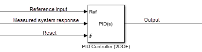 Reset - Внешний триггер сбросаТриггер для сброса интегратора и фильтрации в исходное состояние. Параметр External reset используется для указания типа сигнала, инициирующего сброс. Значок порта указывает тип триггера, указанный в этом параметре. Например, на следующем рисунке показан блок PID Controller (2DOF) непрерывного времени с установленным на rising.