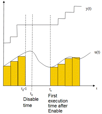Предположим, что имеется подсистема функционального вызова, включающая включенную подсистему, которая содержит блок интегратора дискретного времени. Применяется следующее поведение.