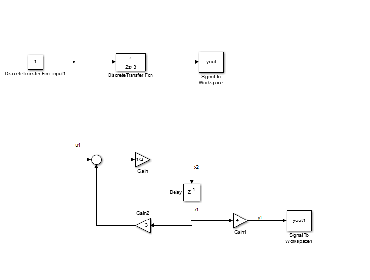 В следующем примере показана взаимосвязь между начальным выходом фильтра и начальным входом и состоянием. При начальном входе u1 первый выход y1 связан с начальным состоянием [x1, x2] и начальным входом следующим образом: