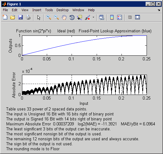 func = 'sin(2*pi*x)'; % Define the range over which to optimize breakpoints xmin = 0; xmax = 0.25; % Define the data type and scaling for the inputs xdt = ufix(16); xscale = 2^-16; % Define the data type and scaling for the outputs ydt = sfix(16); yscale = 2^-14; % Specify the rounding method rndmeth = 'Floor'; % Define the maximum acceptable error errmax = 2^-10; % Choose even, power-of-2 spacing for breakpoints spacing = 'pow2'; % Generate data points for the lookup table [xdata,ydata,errworst]=fixpt_look1_func_approx(func,... xmin,xmax,xdt,xscale,ydt,yscale,rndmeth,errmax,[],spacing); % Plot the sine function (ideal and fixed-point) & errors fixpt_look1_func_plot(xdata,ydata,func,xmin,xmax,... xdt,xscale,ydt,yscale,rndmeth);