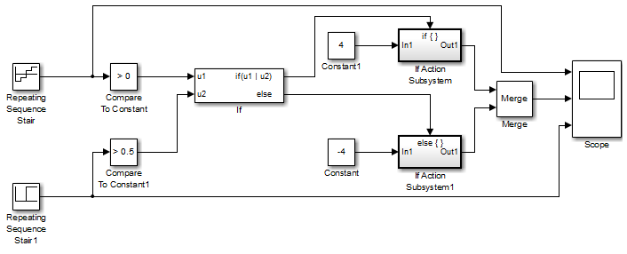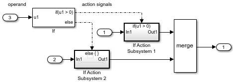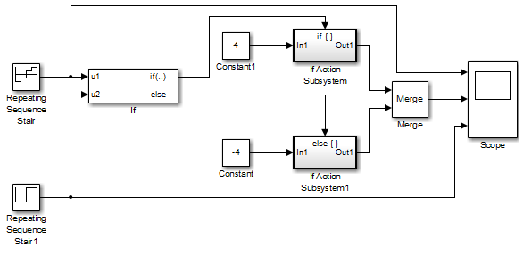В этом примере показано, как объединить сигналы, управляемые блоком If. Блок If выбирает выполнение блока If Action Subsystem из набора подсистем. Независимо от того, какую подсистему выбирает блок If, можно создать один сигнал с блоком Merge. Open model.