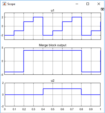 Для этой модели при вводе u1 больше, чем 0 или ввод u2 больше, чем 0.5, выходной сигнал: 4. В противном случае выходные данные будут -4. В блоке «Область» отображаются выходные данные блока «Объединение» с входными данными. u1, и u2.