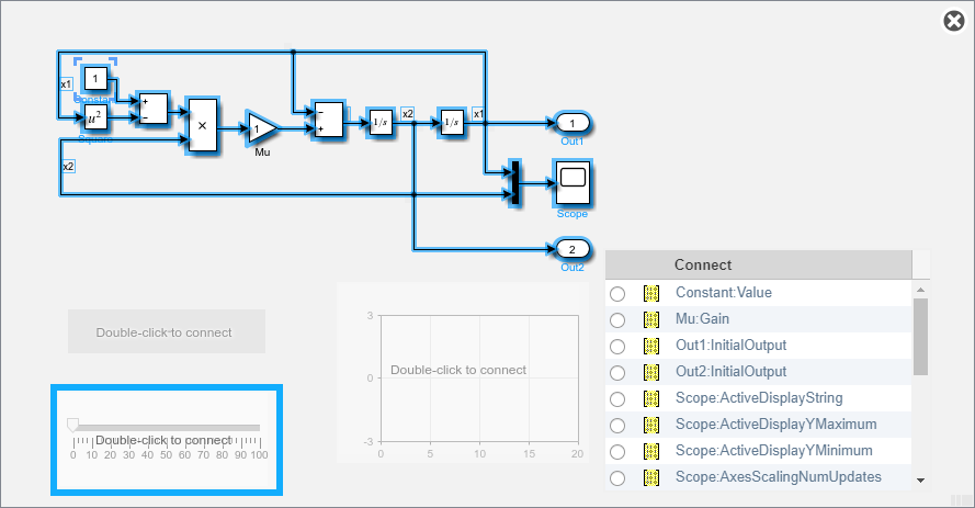 Чтобы подключить другой блок панели мониторинга, остановитесь на другом блоке панели мониторинга и нажмите кнопку «Подключить» над ним. Затем выполните выбор сигналов и блоков в модели и выберите элемент модели для подключения.