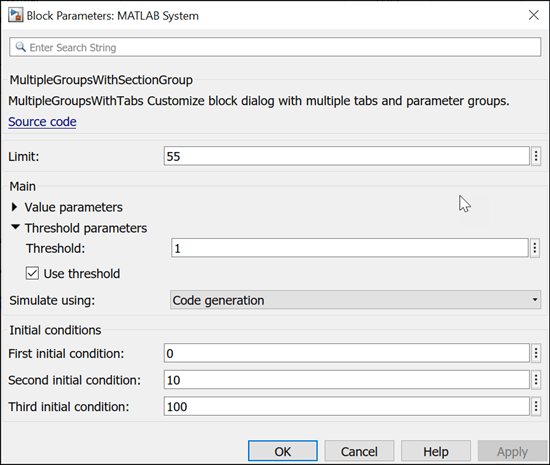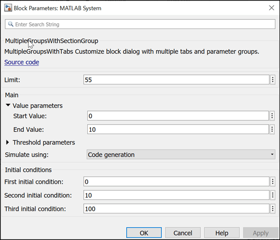 matlab.system.display.SectionGroup(N1,V1,...Nn,Vn) создает группу для отображения свойств системных object™ и экранных сечений, созданных с помощью matlab.system.display.Section. Такие сечения или свойства определяются с помощью пар Имя-Значение свойства (N,V). Группа сечений может содержать как свойства, так и сечения. Вы используете matlab.system.display.SectionGroup для определения групп сечений с помощью getPropertyGroupsImpl способ. Группы сечений отображаются как отдельные вкладки в системном блоке MATLAB. Доступные свойства сечения:
