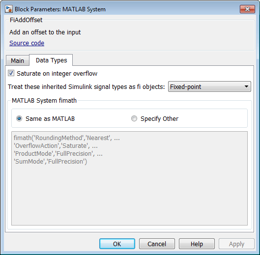 Насыщение при целочисленном переполнении - флажок для управления действием при целочисленном переполнении для встроенных целочисленных типов. По умолчанию установлен флажок, указывающий на насыщение. Это также значение по умолчанию, если в качестве параметра MATLAB System fimath выбрана опция То же, что и MATLAB.