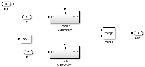 Следующая диаграмма показывает действительное использование блока Merge, объединяющего сигналы от двух условно выполненных подсистем.