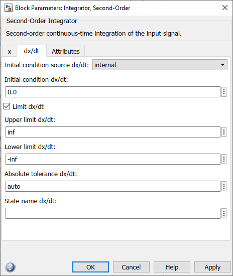 Как и в случае состояния x, состояние dx/dt устанавливается как ограниченное по умолчанию на панели dx/dt диалогового окна блока Integrator Limited второго порядка. Этот параметр, Limit dx/dt, можно задать вручную в блоке интегратора второго порядка. В любом случае необходимо ввести соответствующие пределы для dx/dt.