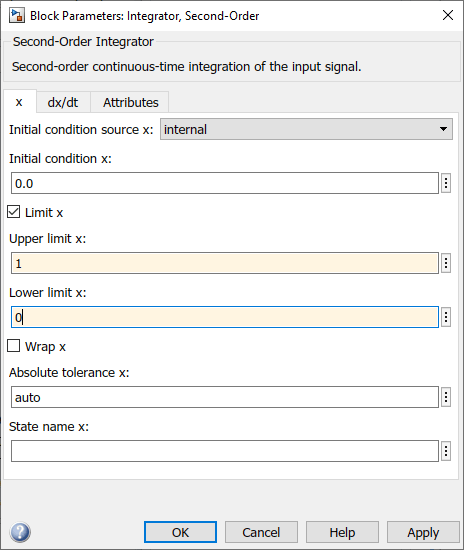 При использовании блока Integrator Limited второго порядка оба состояния ограничены по умолчанию. Но можно также вручную ограничить состояние x в блоке интегратора второго порядка, выбрав параметр Limit x и введя пределы в соответствующие поля параметров.