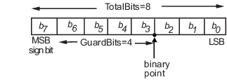 Определите 8-битовый дробный тип данных со знаком с 4 защитными битами. Обратите внимание, что диапазон этого типа данных составляет от -24 = -16 до (1 - 2 (1 - 8)) .24 = 15,875.