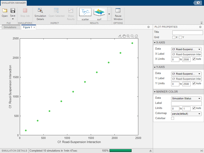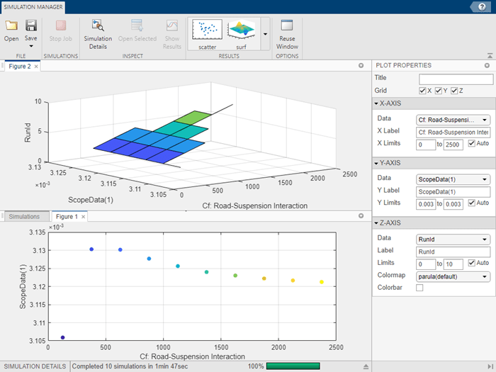 Добавление нескольких графиков в Диспетчер моделирования (Simulation Manager) позволяет наблюдать данные моделирования различными способами. С помощью результатов можно анализировать и изучать пространство проектирования параметров и их поведение.