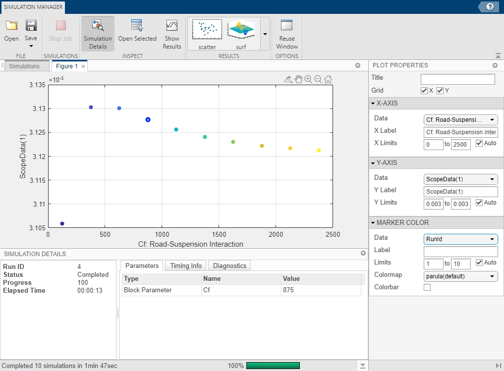 На вкладке «Рисунок 1» можно просмотреть график разброса по умолчанию, где параметр Cf наносится против себя. Используйте Свойства печати (Plot Properties) для редактирования печати. Добавление линий сетки для X и Y путем установки соответствующих флажков. Можно также изменить данные, отображаемые на осях X и Y, и цвет маркера. Изменение данных по оси Y путем выбора ScopeData(1) из раскрывающегося списка Данные. Установите в поле «Данные цвета маркера» значение RunID.