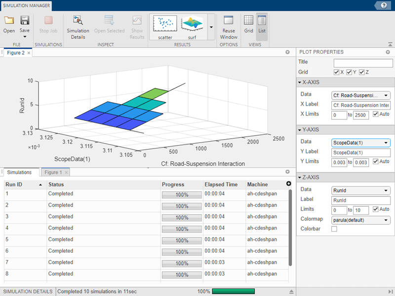 Чтобы просмотреть статус моделирования в представлении списка и представлении сетки, перейдите на вкладку Моделирование (Simulations) рядом с рисунком 1. Переключение между параметрами «Список» и «Сетка» в разделе «Виды» на панели инструментов. В виде списка отображается табличное представление моделирования с определенными подробностями, такими как состояние, параметры и информация о синхронизации. Для большого количества моделирований выберите вид сетки для компактного представления статуса моделирований.