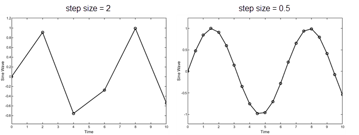 Фиксированный шаг - Временной шаг T(k+1) = T(k) + Δt где Δt является постоянной. Если размер шага слишком велик, результаты моделирования могут иметь большую ошибку. В следующем примере размер шага равен 2 искажает форму синусоидального сигнала. Можно указать размер временного шага в случае решателей с фиксированным шагом, или решатель может автоматически определить размер шага в случае решателей с переменным шагом.