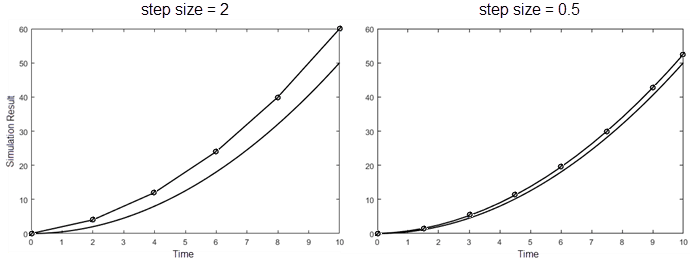 Уменьшение размера шага повышает точность результатов. но это увеличивает время на выполнение моделирования. В следующем примере размер шага равен 2 показывает ошибку около 20 процентов через 10 секунд, в то время как размер шага 0.5 дает результат, более близкий к фактическому решению.