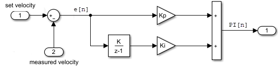Где e[n] - погрешность между сигналом, значение которого контролируется (скорость), и заданным значением (установленная скорость), Kp - постоянная пропорция, Ki является константой интегрирования, и n является временным шагом.