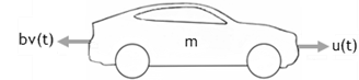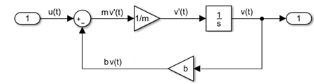 В следующем примере для транспортного средства: u(t) - сила (N), перемещающая транспортное средство вперед, v(t) - скорость (м/с), b - коэффициент сопротивления (Nׂׂ·s/m), и m - масса транспортного средства (кг).