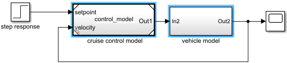 В следующем примере управляющая модель была сохранена в файле модели Simulink. control_model.slx, а затем ссылка из блока модели во второй модели Simulink. Для моделирования механики транспортного средства был добавлен блок подсистемы.
