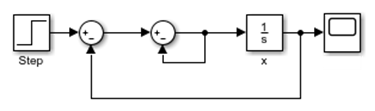 Модель Simulink для этого уравнения можно создать путем добавления блоков, задания поведения блоков и использования сигнальных линий для соединения блоков друг с другом. Следующая блок-схема Simulink реализует дифференциальное уравнение.