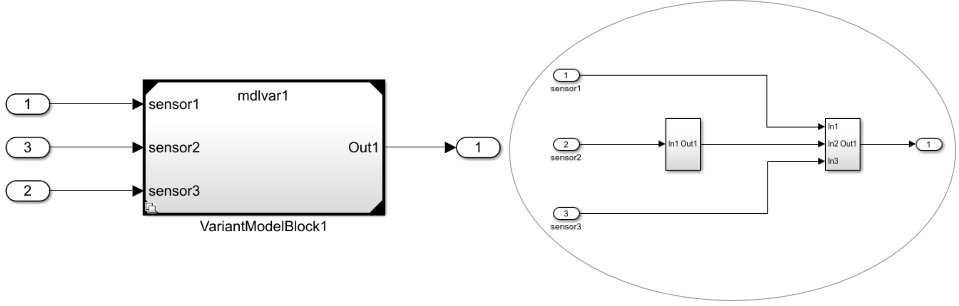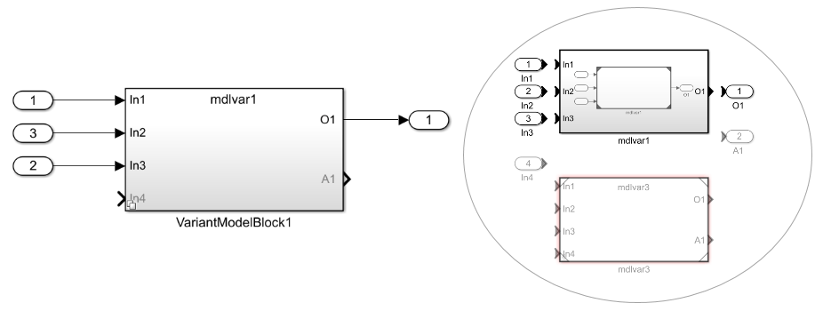 Блок Variant Model имеет управляющие порты с различными номерами портов и сопоставлением имен.
