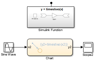 При вызове функции из перехода или метки состояния Stateflow можно использовать различные имена аргументов. Например, блок Simulink Function использует x и y аргументы, в то время как переход Stateflow использует x2 и y2 аргументы для вызова функции.