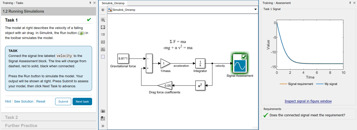 Для инкрементного обучения понятиям Simulink Onramp использует практические упражнения. Вы получаете автоматические оценки и отзывы после отправки задач. Ваш прогресс сохраняется при выходе из приложения, так что вы можете пройти обучение в нескольких сессиях.