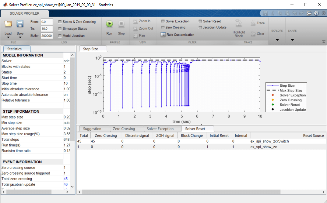 Solver Exception - Показать события исключения решателяВключите этот параметр, чтобы выделить события исключения решателя на графике Размер шага (Step Size) профилировщика решателя.