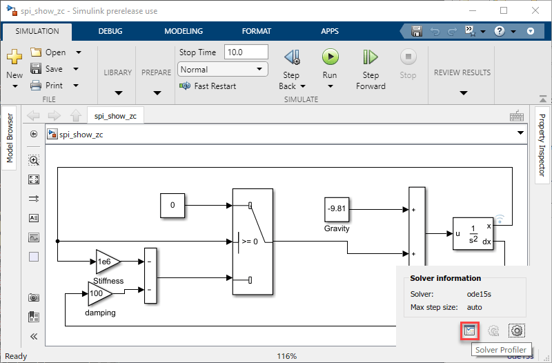 Откройте профилировщик решателя, щелкнув гиперссылку в правом нижнем углу редактора Simulink ®.