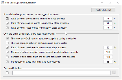 Rule Customization - Изменение пороговых значений для правил профилировщикаЩелкните Настройка правила (Rule Customization) в профилировщике решателя, чтобы получить доступ к набору правил. Можно изменить пороговые значения для большинства из этих правил, а также выбрать правила, которые необходимо применять выборочно во время прогона моделирования.