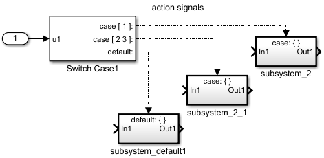Случаи для блока Switch Case содержат подразумеваемый разрыв после выполнения блока Switch Case Action Subsystem. Таким образом, для