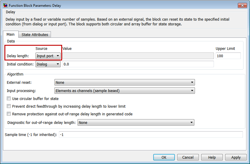 Delay length - Длина задержкиDialog (по умолчанию) | Input portУкажите, следует ли вводить длину задержки непосредственно в диалоговом окне (фиксированная задержка) или наследовать задержку от входного порта (переменная задержка).