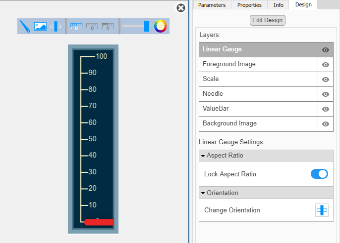 В режиме проектирования имеется доступ к параметрам и настройкам блока, позволяющим проектировать внешний вид блока. С помощью панели инструментов над блоком можно изменить фоновое изображение или изображение иглы, а также задать непрозрачность и цвет для масштаба, меток засечек и строки значений. Чтобы создать вид масштаба, выберите аспект масштаба, который требуется отредактировать, в средней части панели инструментов. Используйте элементы управления, расположенные справа на панели инструментов, чтобы задать цвет и непрозрачность. Можно также щелкнуть и перетащить, чтобы изменить положение иглы или шкалы.