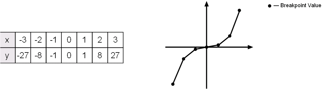 Следующий пример иллюстрирует одномерную таблицу поиска, которая аппроксимирует функцию y = x3. Таблица поиска определяет свои выходные (y) данные дискретно по входному (x) диапазону [-3, 3]. Следующая таблица и график иллюстрируют отношение ввода/вывода: