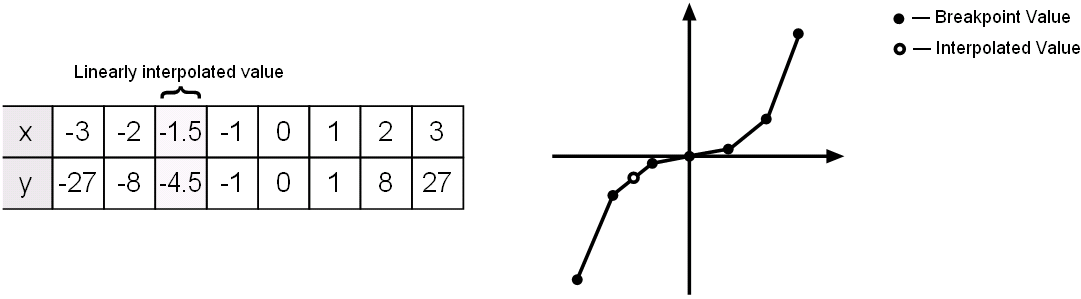 Когда блок таблицы поиска обнаруживает входные данные, которые не соответствуют ни одному из значений x таблицы, он может интерполировать или экстраполировать ответ. Например, таблица подстановки не определяет входное значение -1,5; однако блок может линейно интерполировать ближайшие смежные точки данных (xi, yi) и (xi + 1, yi + 1). Например, учитывая эти два момента: