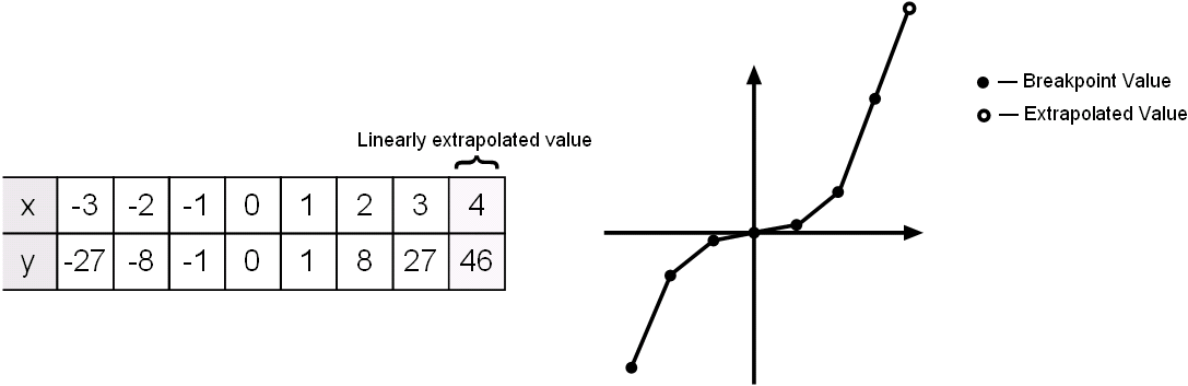 Аналогично, хотя таблица подстановки не включает данные для значений x за пределами диапазона [-3, 3]блок может экстраполировать значения, используя пару точек данных на любом конце таблицы. Учитывая входное значение 4, блок таблицы поиска линейно экстраполирует ближайшие точки данных (2, 8) и (3, 27) для оценки выходного значения 46.