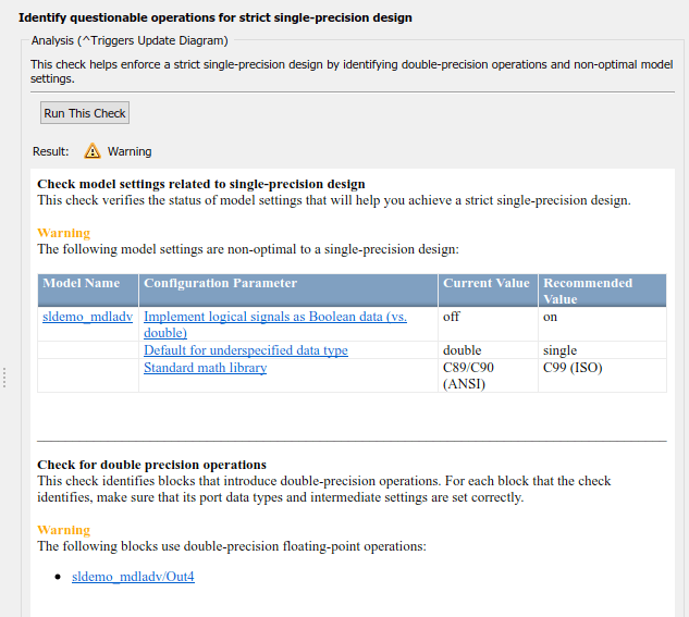 На левой панели окна Мастер модели (Model Advisor) выберите выделенную проверку Определить сомнительные операции для строгой конструкции с одной точностью. В окне редактора модели помощник по модели подсвечивает блоки или компоненты, связанные с предупреждением. В этом случае консультант по модели находит Outport блок, использующий двойную точность из-за установки параметра конфигурации Default for underspecified data type.