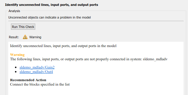Вход по умолчанию для Outport блок установлен в значение double. Model Advisor генерирует предупреждение, поскольку Outport блок не подключен к другому блоку. После просмотра результатов проверки в окне модели и окне Model Advisor можно исправить предупреждения или ошибки.