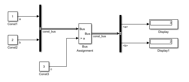 Подключите выходную шину Bus Creator const_bus к первому порту блока назначения шины. Элементы шины a и b доступны для назначения им новых значений.