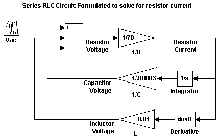 На следующей диаграмме показано это уравнение, смоделированное в Simulink, где R является 70, C - 0.00003, и L является 0.04. Напряжение резистора представляет собой сумму напряжения источника, напряжения конденсатора и напряжения индуктора. Ток в цепи необходим для вычисления напряжений конденсатора и индуктора. Чтобы вычислить ток, умножьте напряжение резистора на коэффициент усиления 1/R. Вычислите напряжение конденсатора путем интегрирования тока и умножения на коэффициент усиления 1/C. Вычислите напряжение индуктора, взяв производную тока и умножив на коэффициент усиления L.