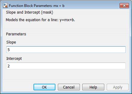 Каждый блок имеет собственное диалоговое окно, что усложняет задание значений переменных линейных уравнений. Для упрощения пользовательского интерфейса маска применяется к блоку подсистемы верхнего уровня.