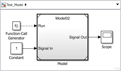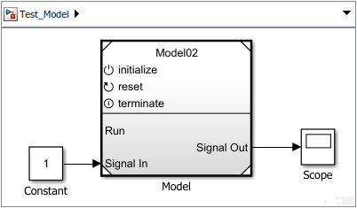 Проверьте ссылочный компонент модели, подключив блок генератора вызовов функций к Run порт. Подключите блок константы к Signal In порт и блок Scope для Signal Out порт.