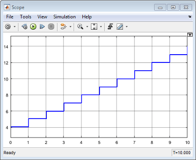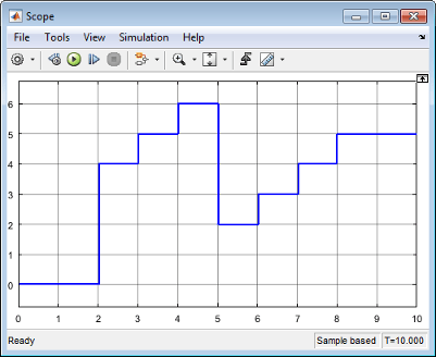 Модель не может выполняться до второго временного шага, когда состояние блока инициализируется равным 4. На пятом шаге времени вызов функции сброса в порт сброса инициирует выполнение блока функции сброса. На девятом шаге времени подсистема прекращает выполнение, и состояние блока остается постоянным.