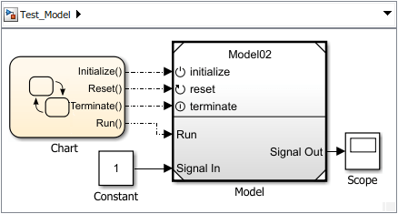 Выполните моделирование, чтобы проверить правильность моделирования модели из родительской модели. Когда модель моделируется без портов событий вызова функции, блок Initialize Function выполняется в начале моделирования, а блок Terminate Function - в конце моделирования.